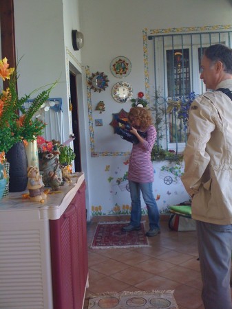 On the front porch, Cousin in the foreground, lurking off camera; Auntie unseen inside the door, being filmed “discovering” the place; more mirrors and plastic foliage and gnomes and whatnot scattered about.