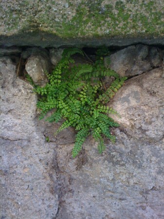 Anyway, as I was ghosting around a corner staying off-camera, I noticed a cool crumbling wall with pretty little ferns growing out of it. I like ferns.