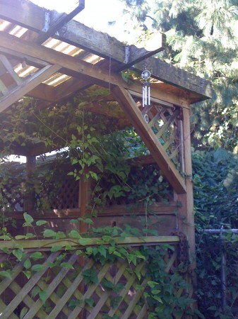 I searched all my photos, and I apparently have never taken a picture of that side of the gazebo. Well, I have now, here’s the mystery chimes: