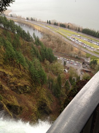 From the top of Multnomah Falls, peering over the rail down into the parking lot waaaayyyy below
