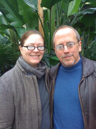 A photo I like, of Mark and Elizabeth Bourne, from when I visited them last year in an icy-cold February and we went to the conservatory, and their glasses steamed up the moment we walked inside: