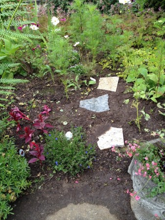Then I tackled the front yard. I pulled out gobs and gobs of a volunteer plant that was making a nice pretty ground cover, until it decided to take over and strangle everything. Then I put in a few pieces of granite to make steps, et voila!